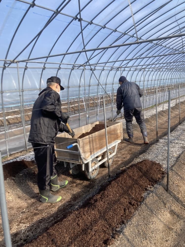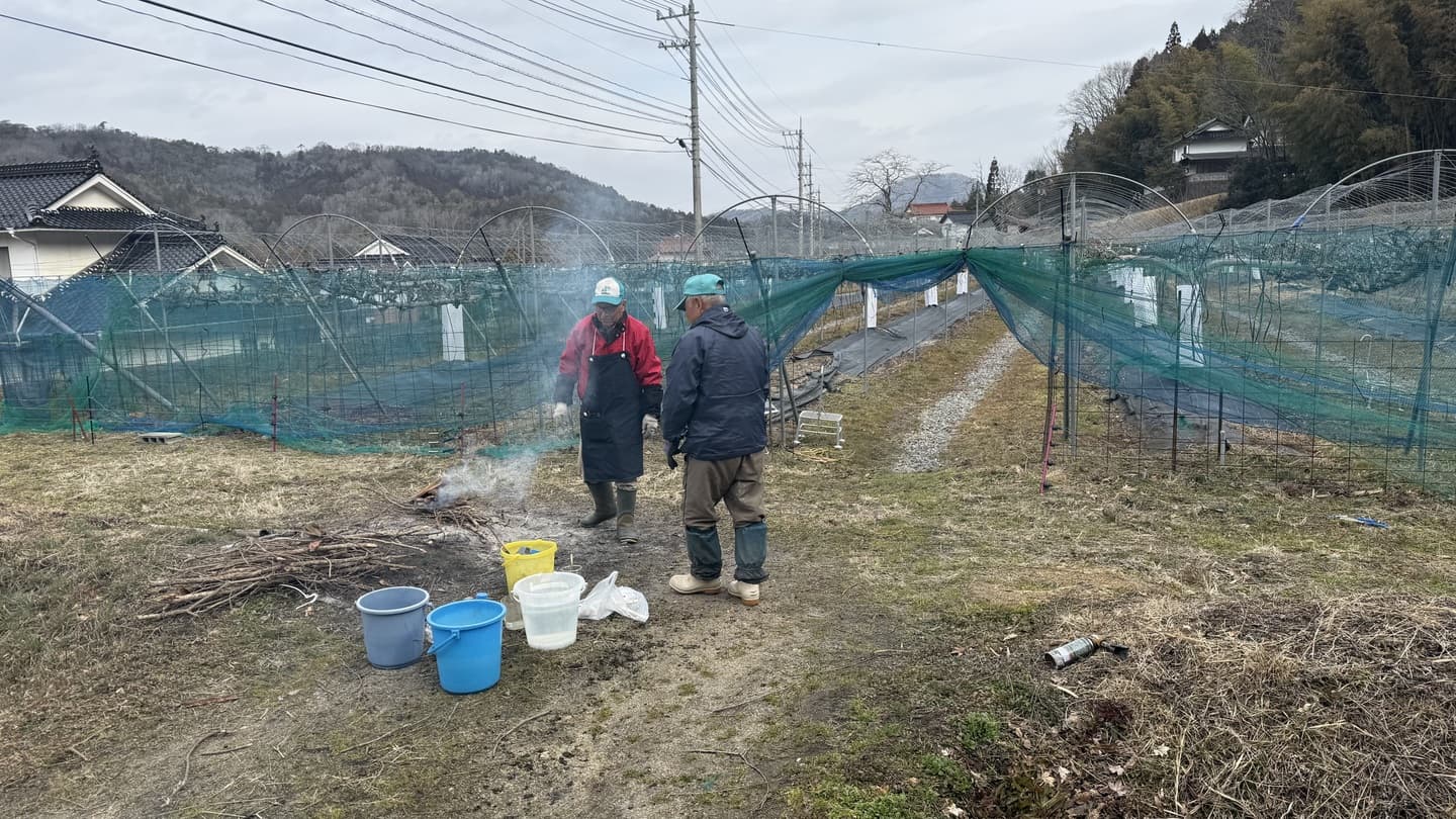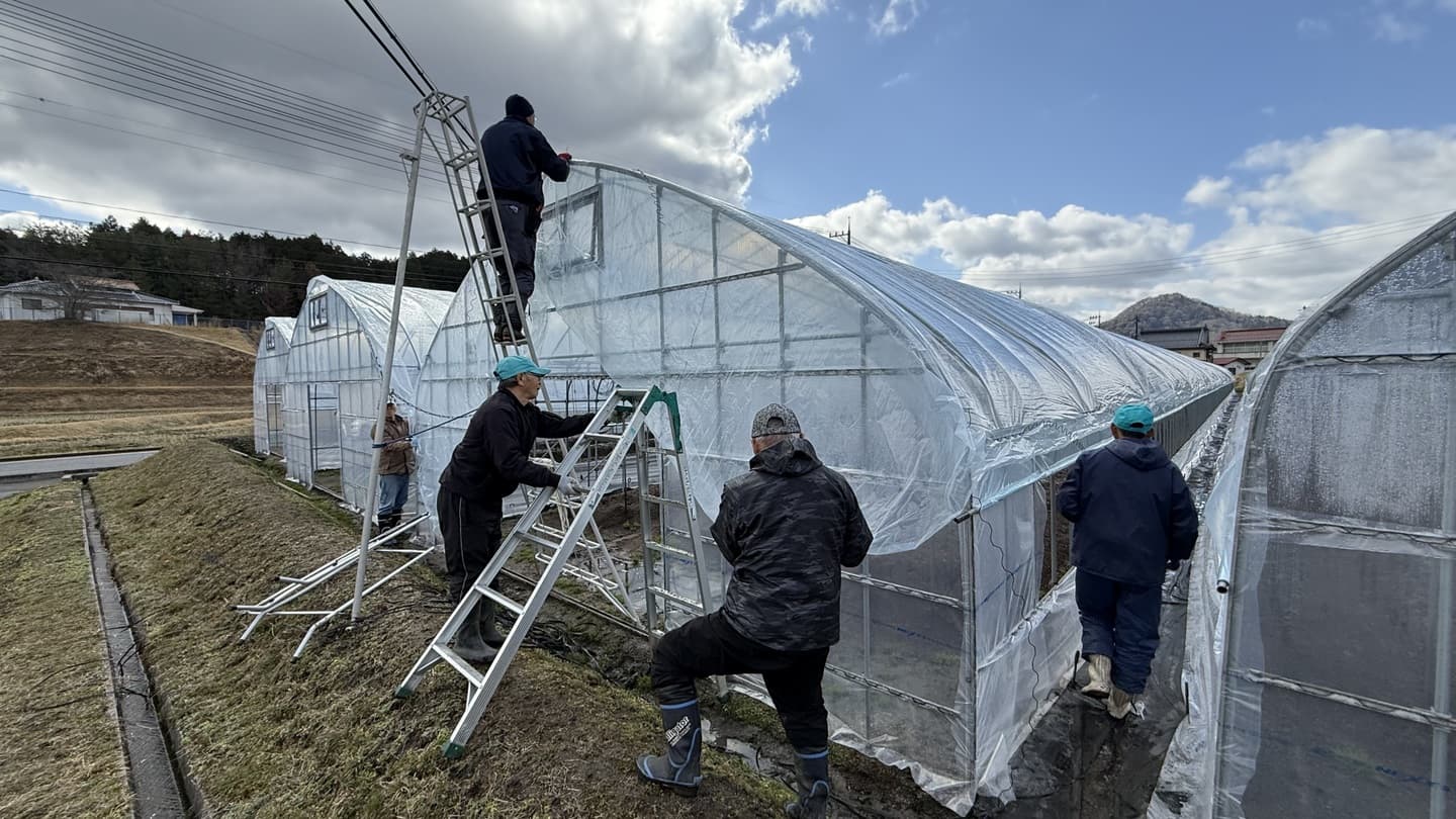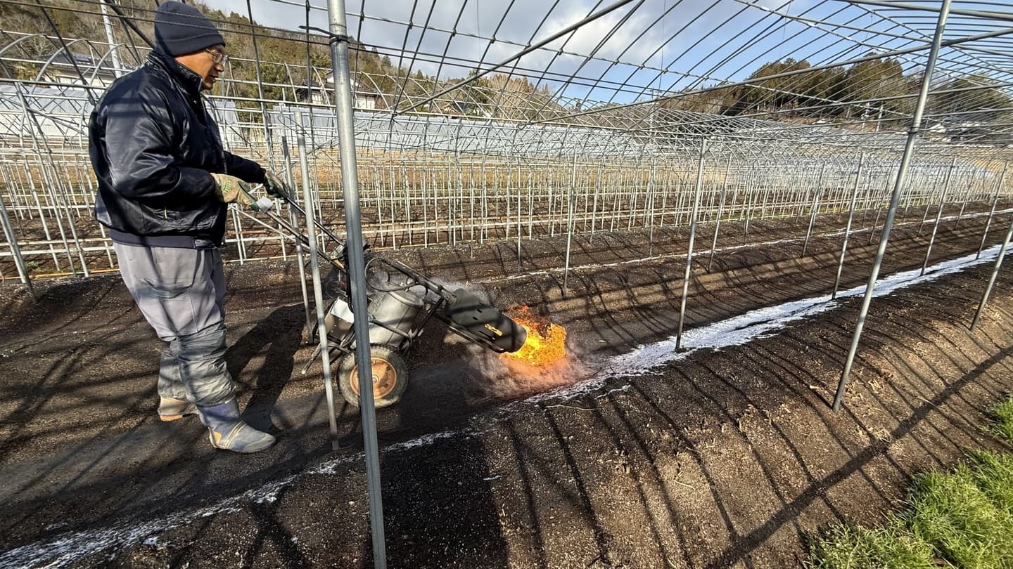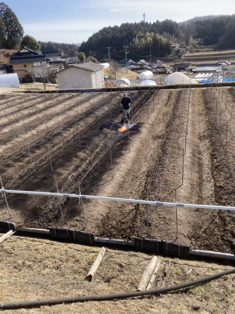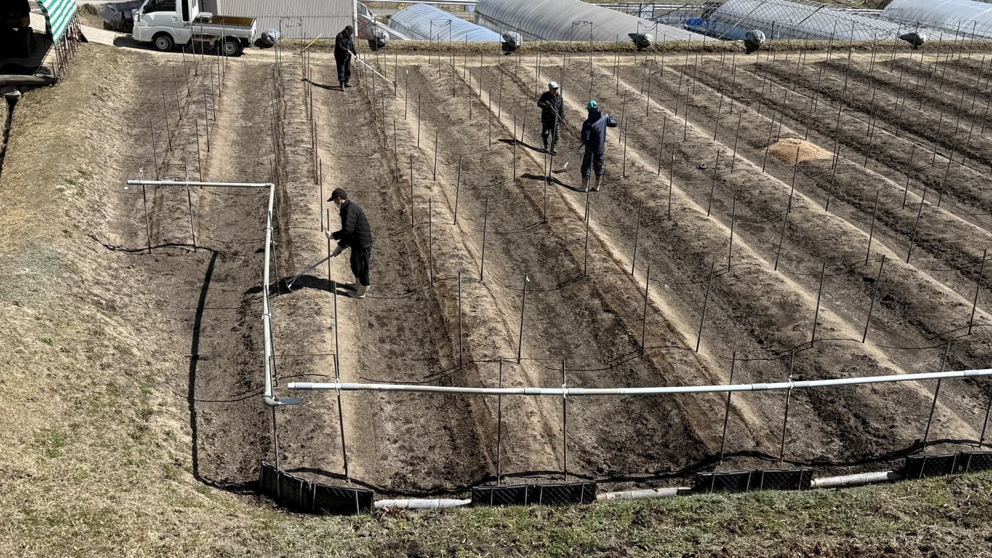 HOME | 農作業だより | 営農風景写真_2026春 アスパラ 水稲 ブドウ ハウスのビニールシート貼り替え作業 ハウス4棟の一斉貼り替え 畝焼き 土壌をバーナーで消毒 施肥と堆肥 畝を整備し肥料と堆肥を散布 ワイヤーメッシュ・トタン張りと補修 猪・鹿の対策と補修 畦畔・入排水口等の補修 至る所で補修が必要 土作り ディスクローターでの耕転、肥料散布 剪定作業 芽かき、誘引、芽傷処理 戻る ページトップへ